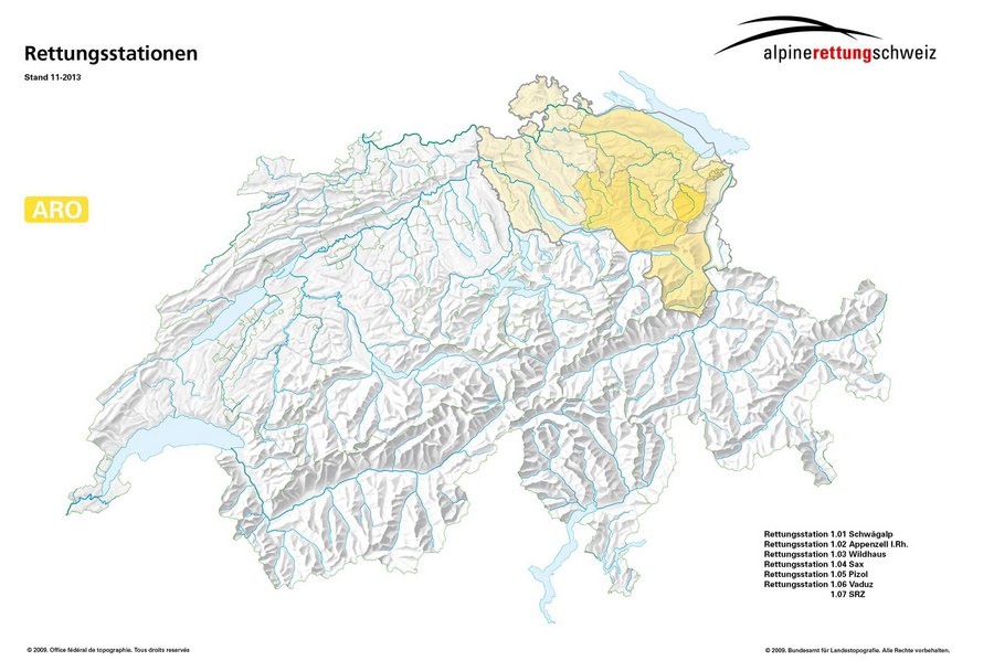 Im Regionalverein Alpine Rettung Ostschweiz sind die Kantone Appenzell Innerrhoden, Appenzell Ausserrhoden, St. Gallen, Thurgau, Schaffhausen, Zürich und der östliche Teil des Aargaus zusammengeschlossen. Das Fürstentum Lichtenstein wird ebenfalls über die ARO alarmiert. Schutz und Rettung Zürich (SRZ) ist mit seinen Fachspezialisten Helikopter (RSH) angeschlossen. Mitglieder sind die SAC-Sektionen: SAC Säntis, SAC St. Gallen, SAC Toggenburg, SAC Rhein, SAC Piz Sol. Sie haben (Liechtenstein und SRZ mitgerechnet) sieben Rettungsstationen.
